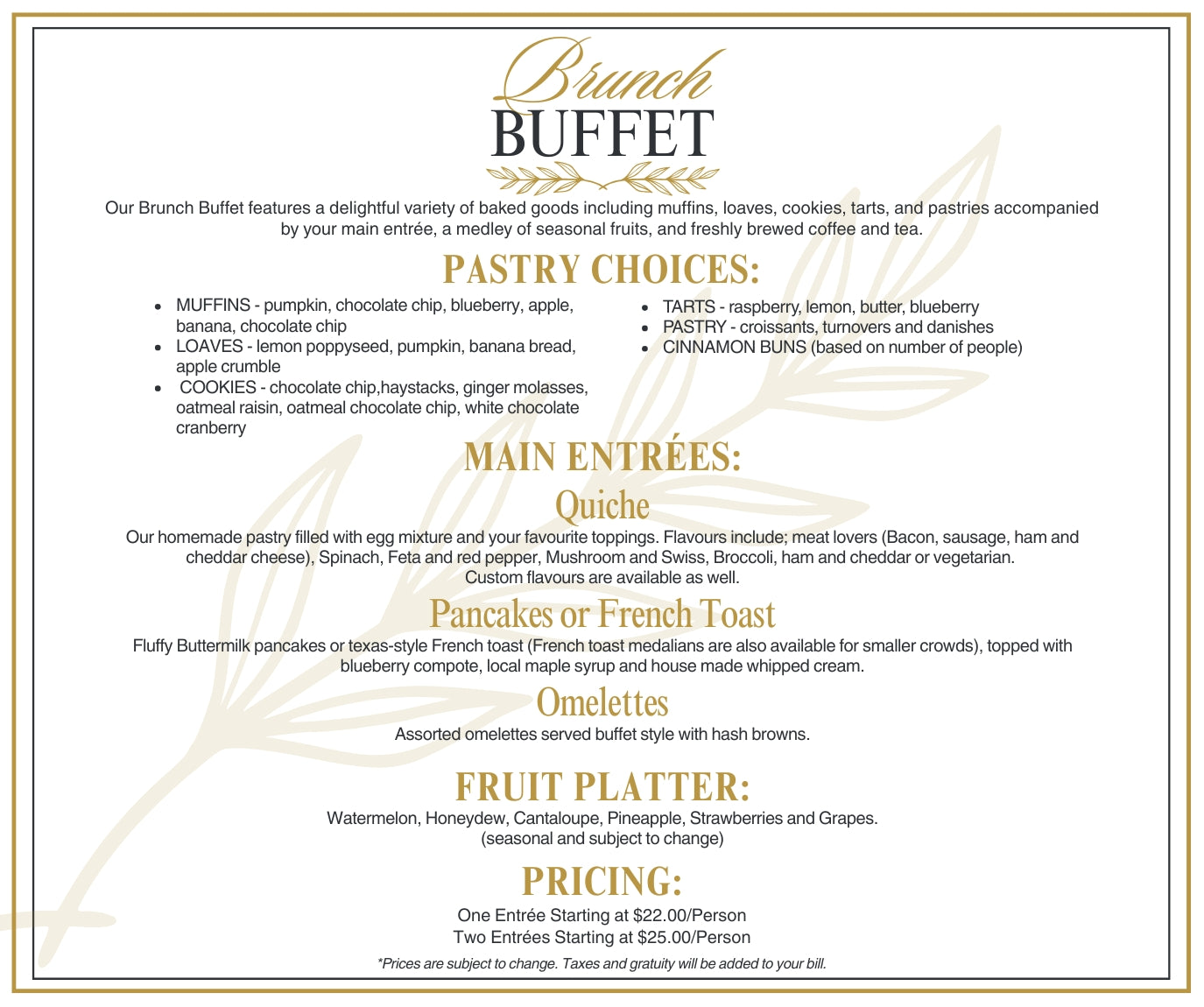 Our Brunch Buffet features a delightful variety of baked goods including muffins, loaves, cookies, tarts, and pastries accompanied by your main entrée, a medley of seasonal fruits, and freshly brewed coffee and tea.