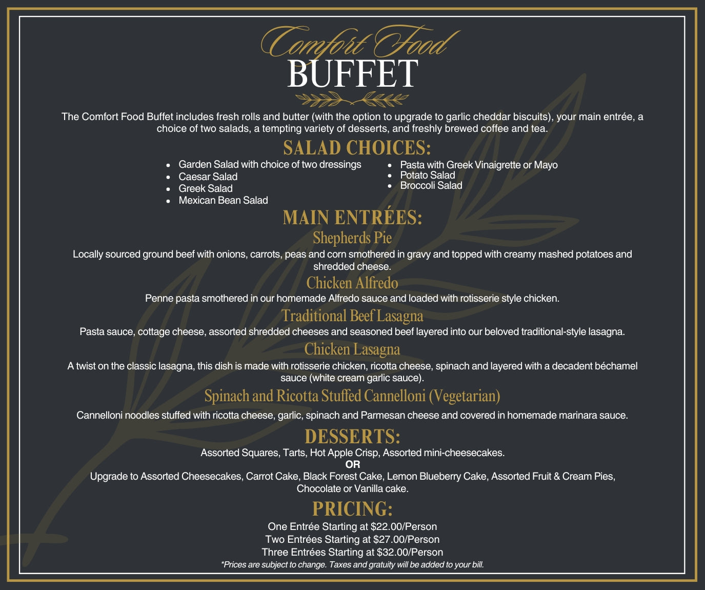 The Comfort Food Buffet includes fresh rolls and butter (with the option to upgrade to garlic cheddar biscuits), your main entrée, a choice of two salads, a tempting variety of desserts, and freshly brewed coffee and tea.