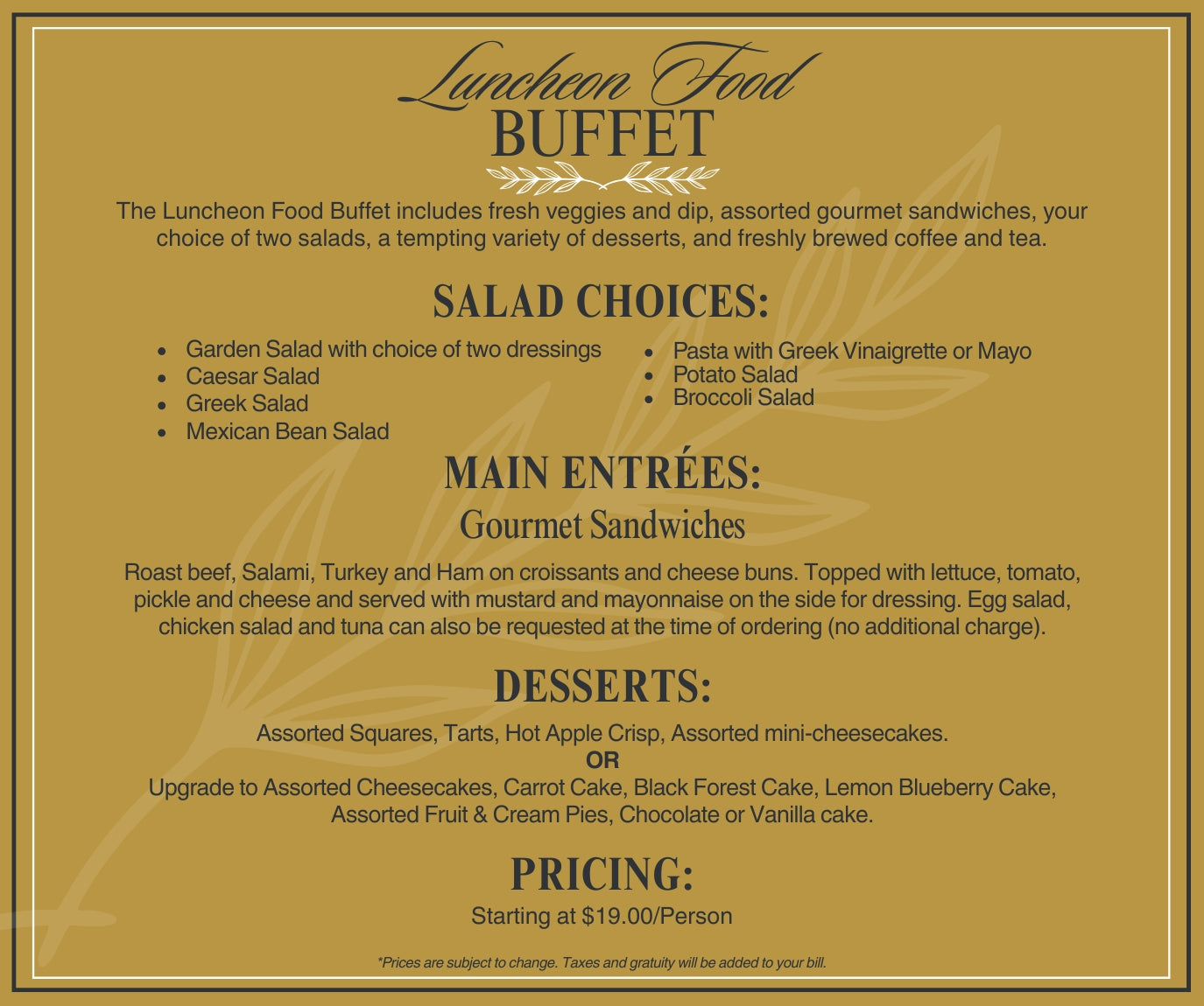 The Luncheon Food Buffet includes fresh veggies and dip, assorted gourmet sandwiches, your choice of two salads, a tempting variety of desserts, and freshly brewed coffee and tea.